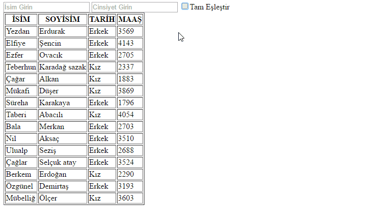 Aşağıdaki örnekte arama yapmak için iki tane textbox kutumuz mevcut. Birinci kutuda isme göre arama, ikinci kutuda da cinsiyete göre arama yapılmaktadır. İki textboxa da değer girişi olduğunda tüm eşleşen satırlarlara göre süzme işlemi yapılmış olacaktır.